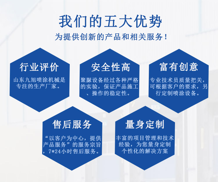 山東九旭機(jī)械科技有限公司歷經(jīng)十幾年的發(fā)展,已成長為液壓聚脲設(shè)備行業(yè)頗具實力的設(shè)備制造業(yè)之一。主要產(chǎn)品:聚氨酯高壓噴涂機(jī)、聚氨酯高壓發(fā)泡機(jī)、液壓聚脲噴涂設(shè)備及設(shè)備配件(聚氨酯高壓噴槍、槍嘴、加熱管道、料塊、摩擦副、增壓泵、混合式、提料泵等)也是堅持最好的質(zhì)量服務(wù)用戶,